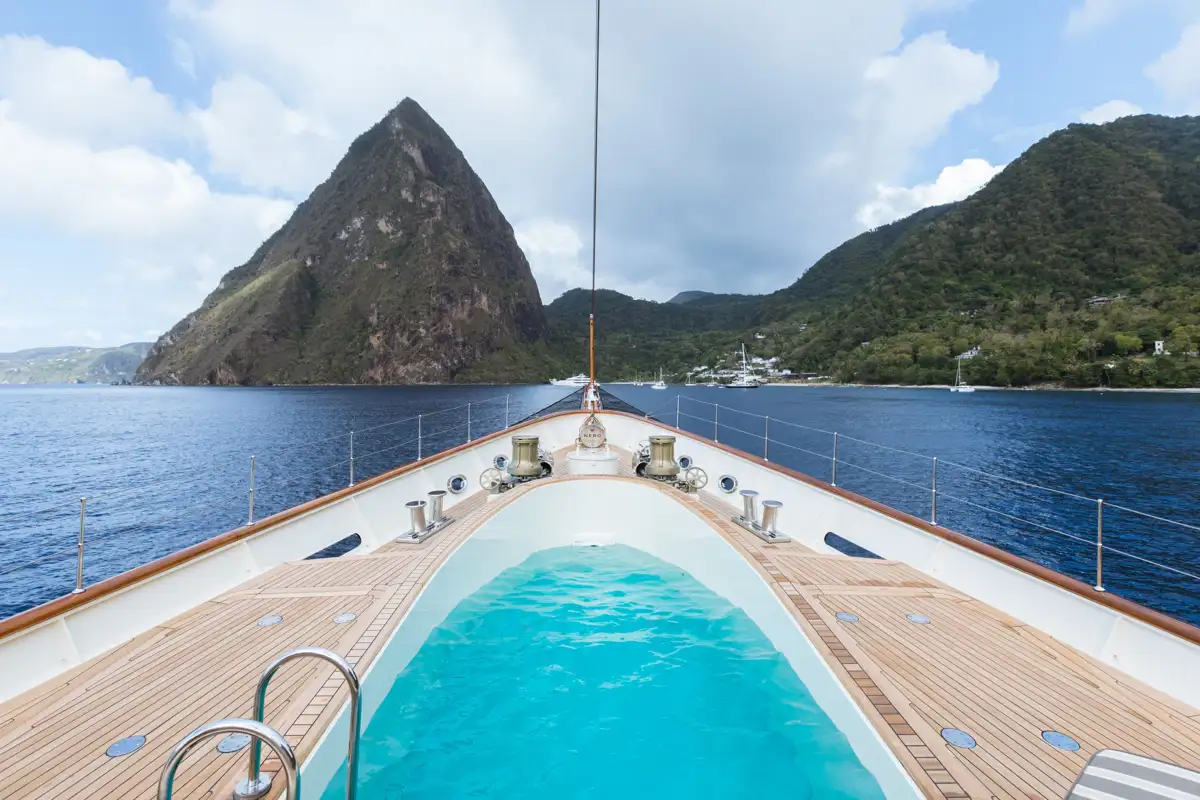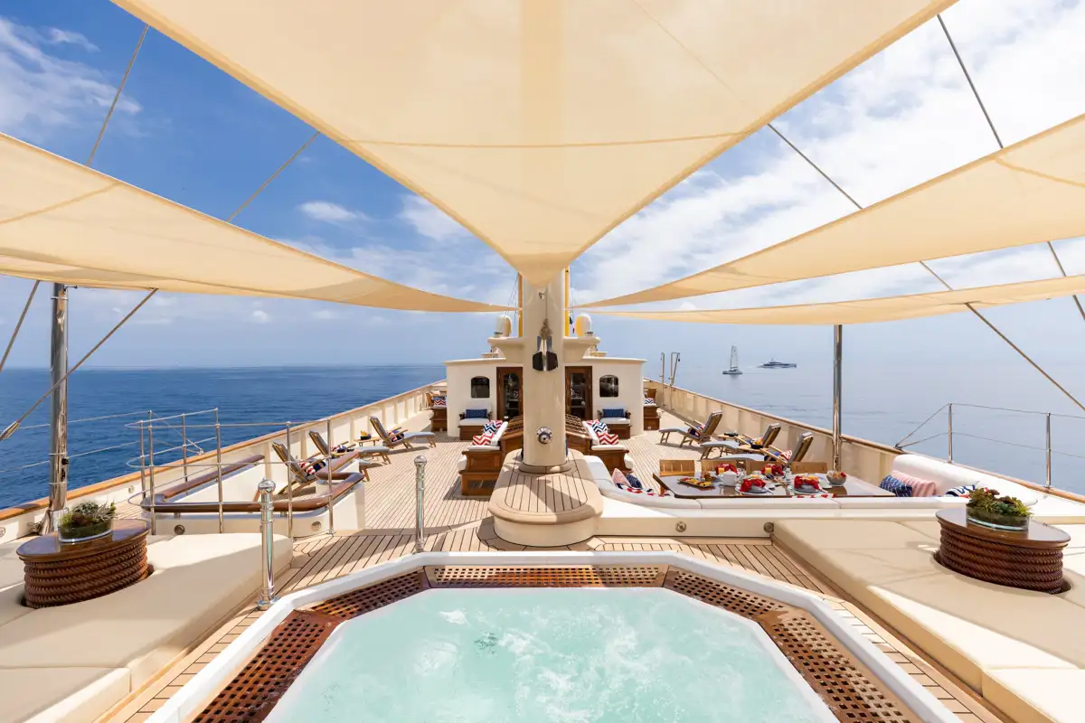 She has a wealth of guest deck spaces, from her secluded top deck sunpads to her starboard-side bathing platform and boarding ladder. A vast sun deck has a sunpad-surrounded jacuzzi to sink into after working out in the fully equipped gym, casual open-air dining, and a variety of lounge and sunbathing spaces. Walkaround sidedecks lead to banquette seating forward of the bridge.