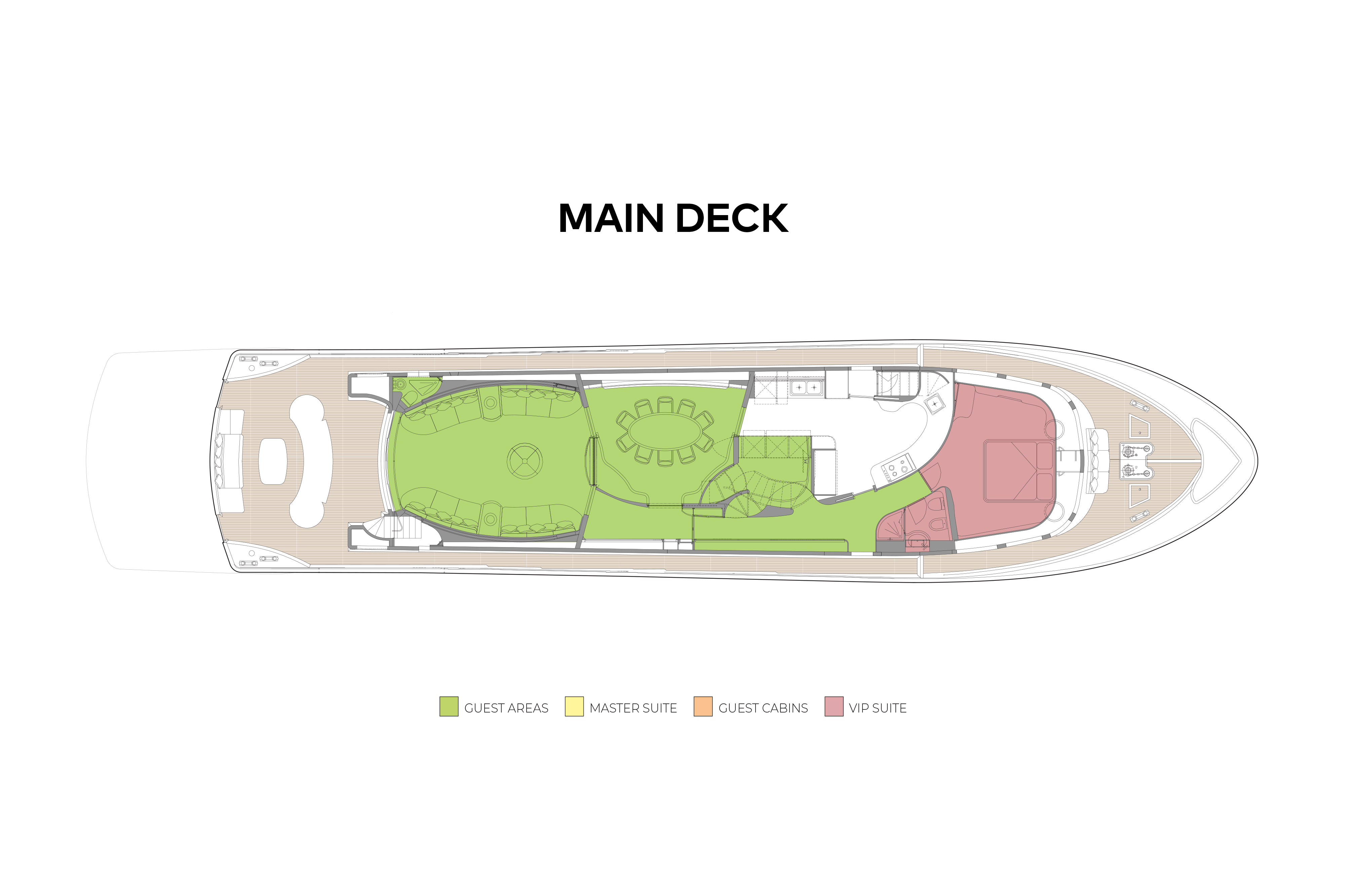 There is open-air dining on the main deck aft and steps leading down to the swim platform and tender and toy garage. Sidedecks lead forward to a large foredeck sunpad.