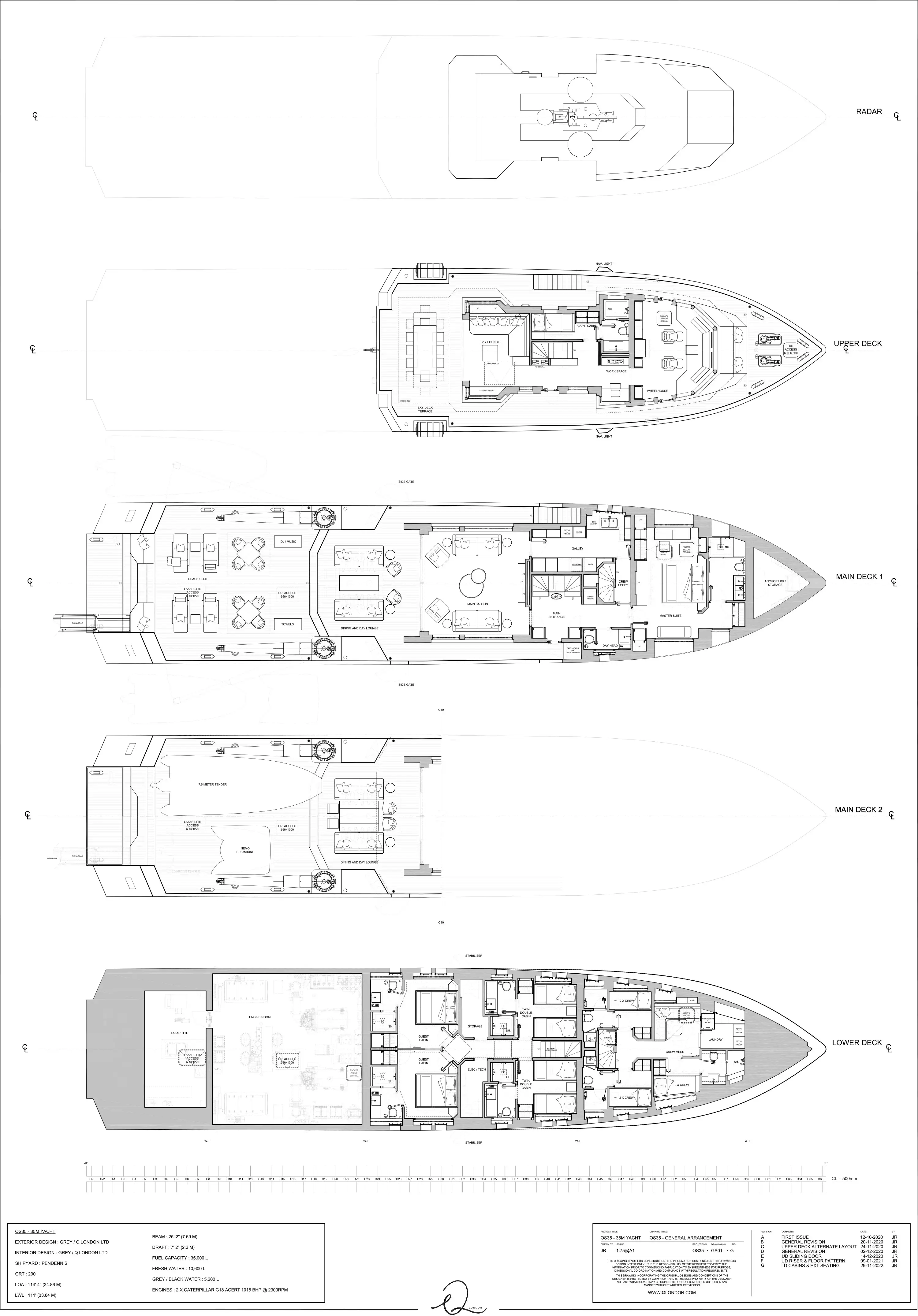 Twin Caterpillar C18 ACERT engines give her a top speed of 14.5 knots, a cruising speed of 12 knots and a maximum range of 3,000nm at 9 knots. CMC Marine stabilisers ensure guest comfort underway and at anchor.