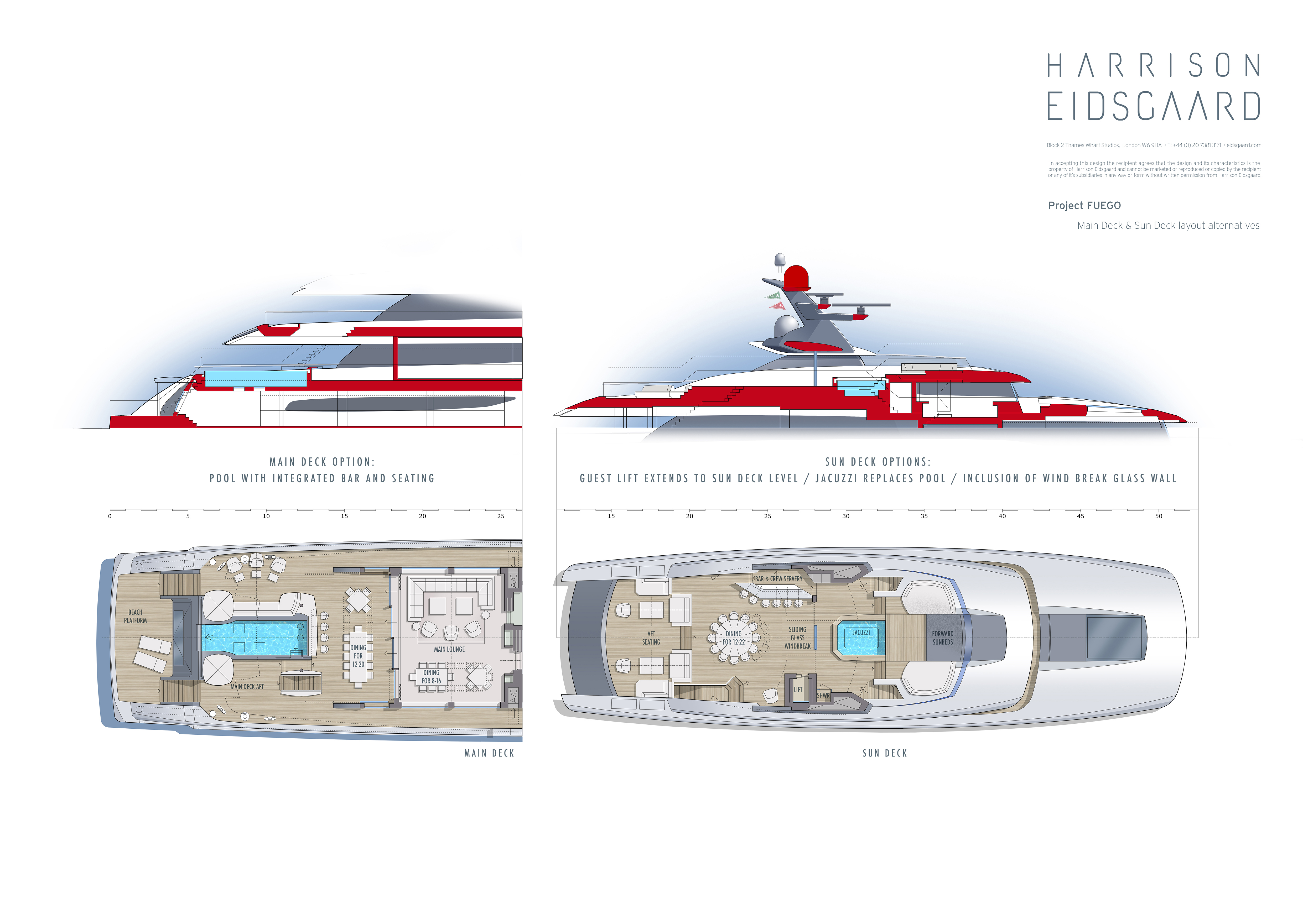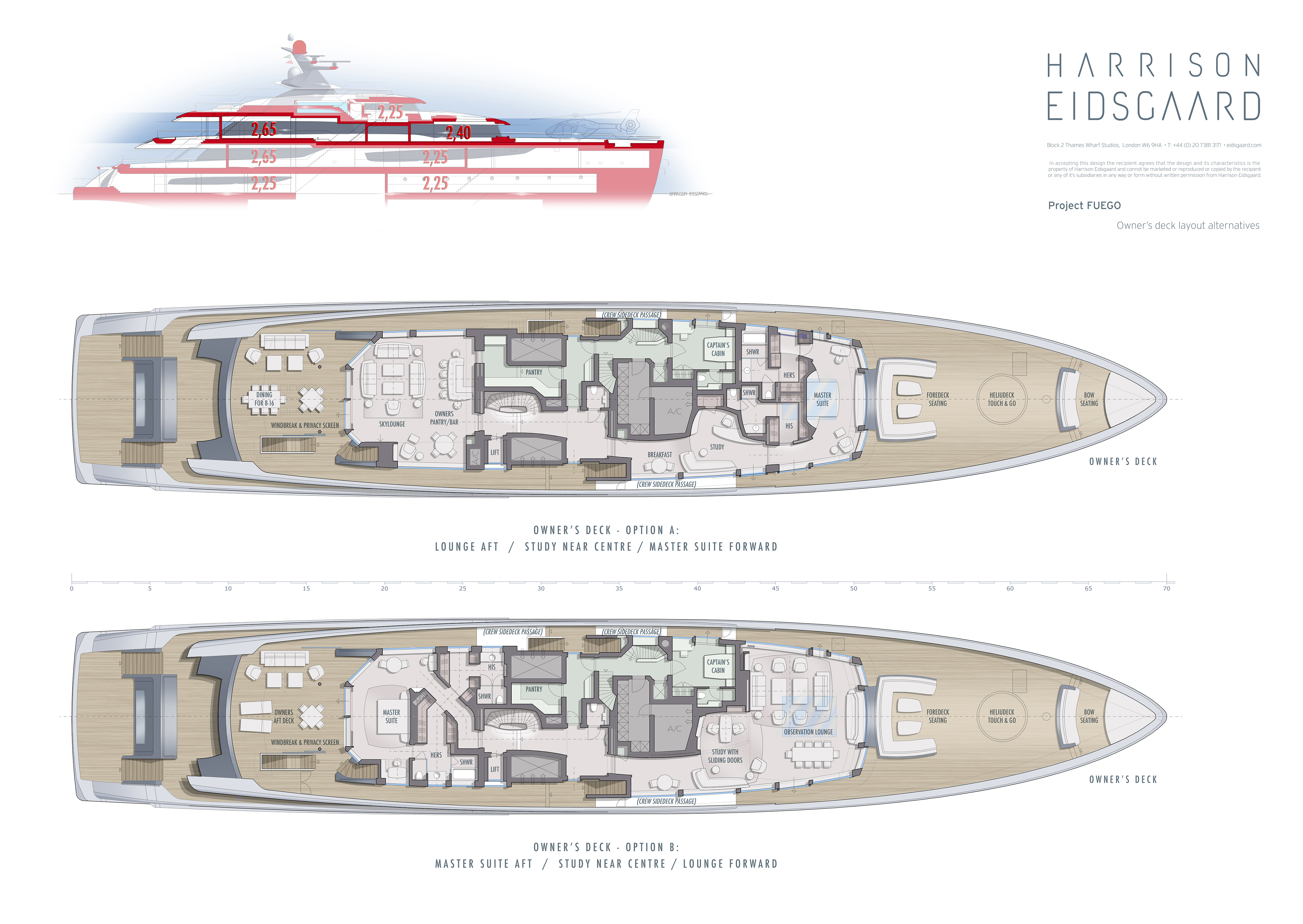 The owner's deck offers huge opportunities for personalisation. The owner's stateroom, with study and breakfast area, can be forward below a vast skylight with access to a private lounge area and terrace on the foredeck, which is also a touch and go helipad. Aft is a sky lounge with bar opening onto a large private terrace aft. A second option has the owner's stateroom facing overlooking a private terrace, forward is an observation lounge with formal dining and a study that can be closed off. The foredeck has the same lounge, terrace and helipad configuration.