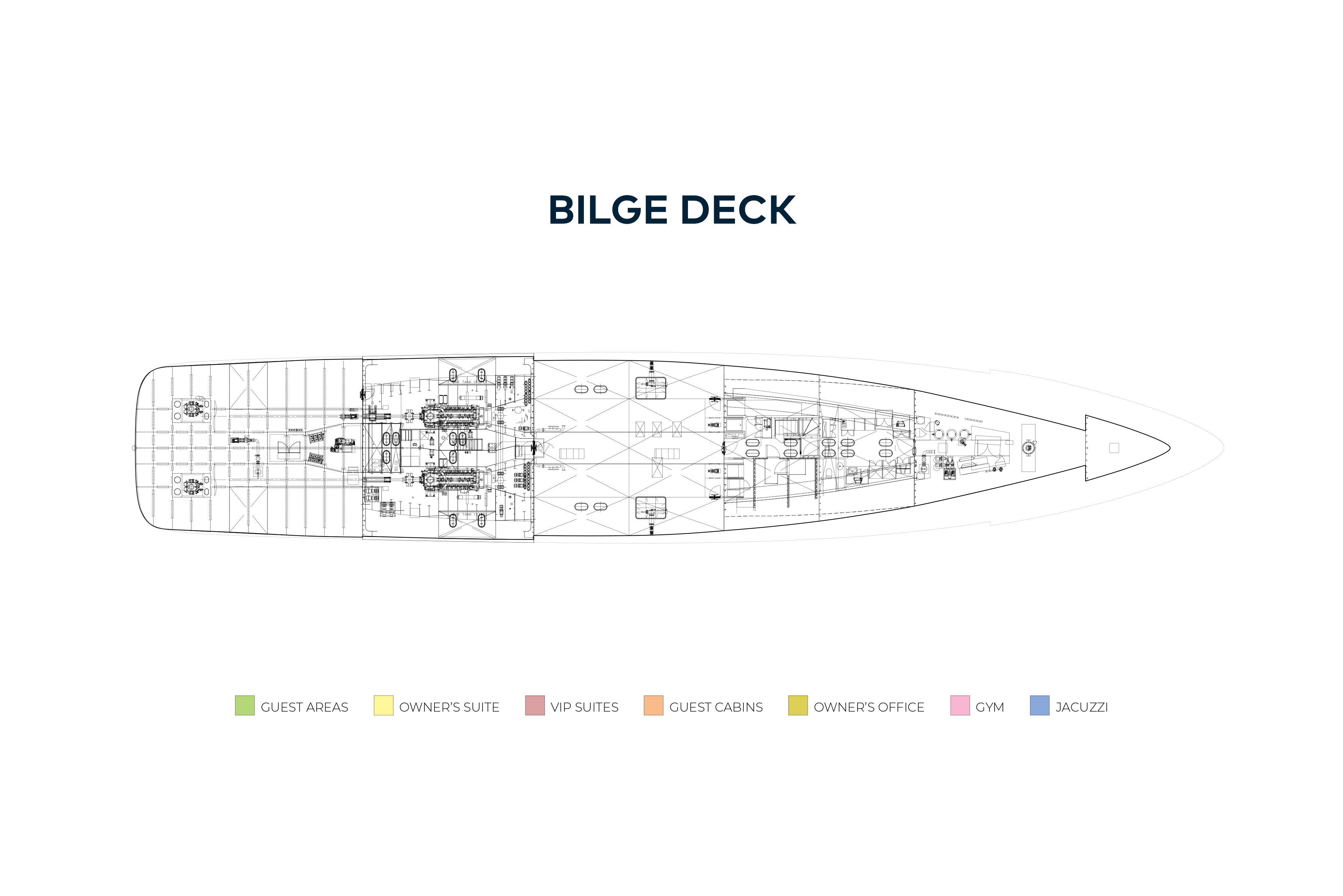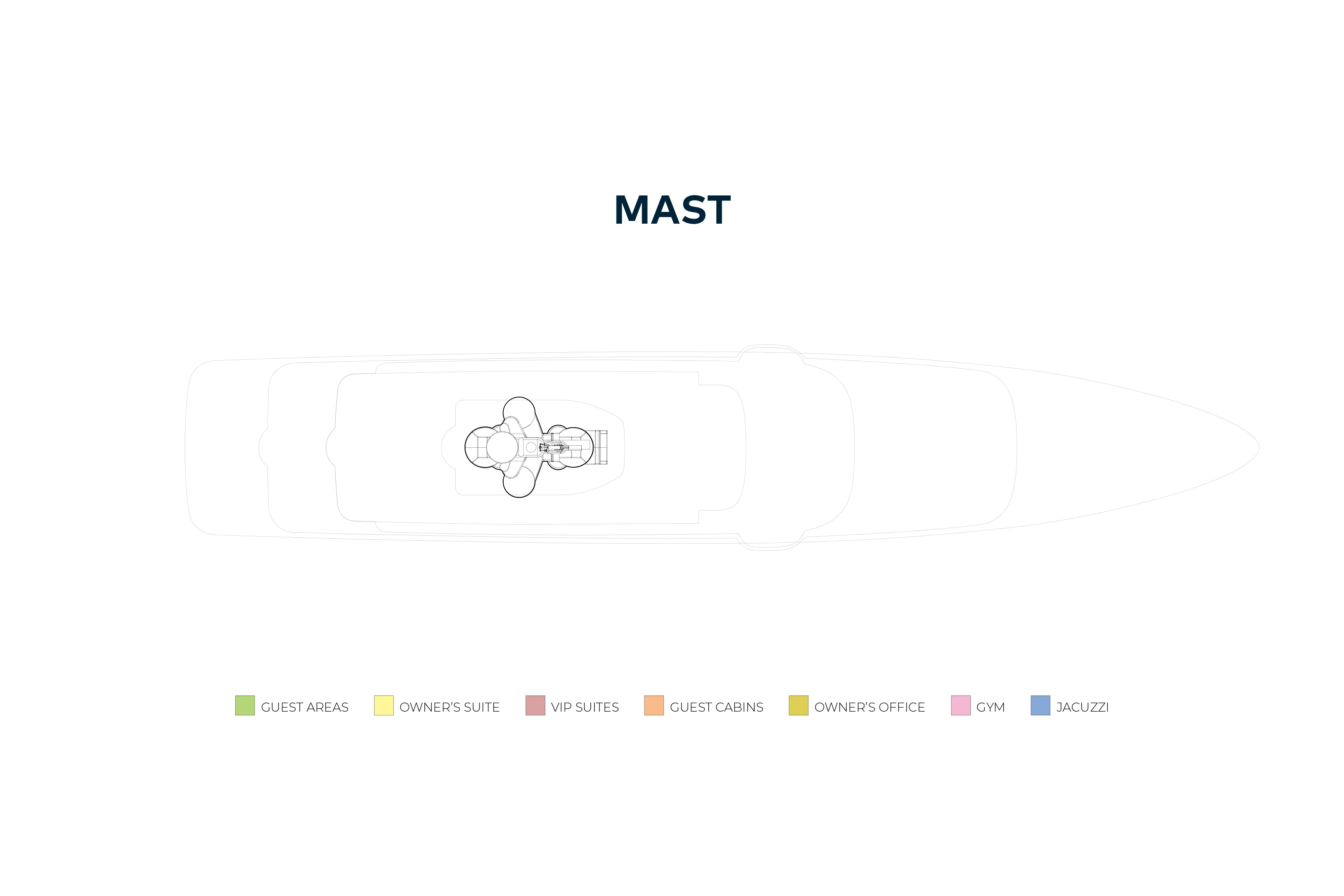 Twin 2,447hp Caterpillar diesel engines give her a top speed is 18 knots, a cruising speed of 15 knots and a transatlantic range of 7,000nm at her passage speed of 12 knots. A full-beam tender and toy garage aft on the lower deck launches 7.7m (25.3ft) Ski Nautique and 7m (23ft) Novurania tenders through shell doors either side.
