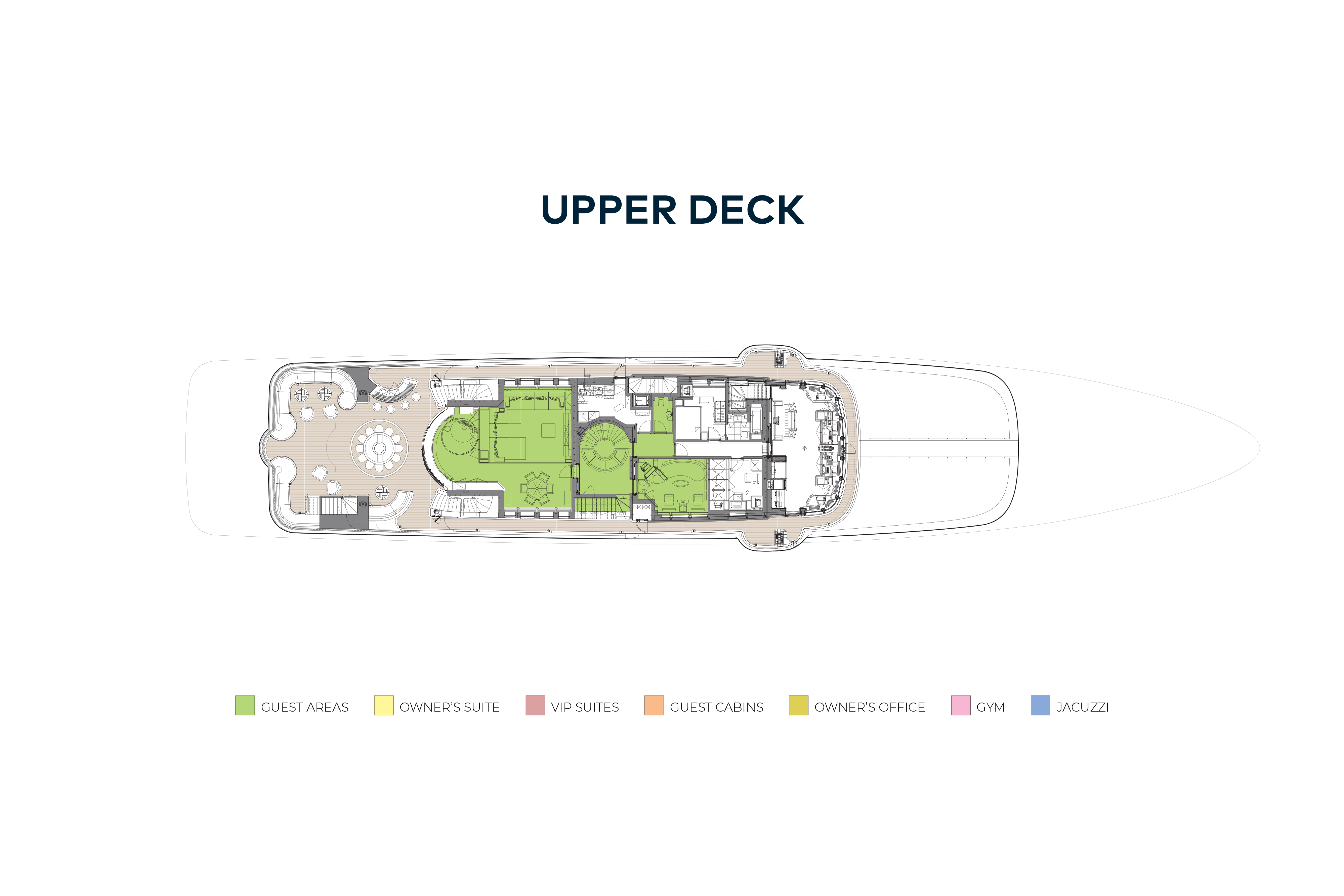 There is a dayhead off the main lobby and a gym and wellness area with massage table and beauty salon to starboard off a corridor leading to the VIP and owner’s suites. Spiral stairs wind around an intricate glass sculpture brought to life by natural light from a sun deck skylight.