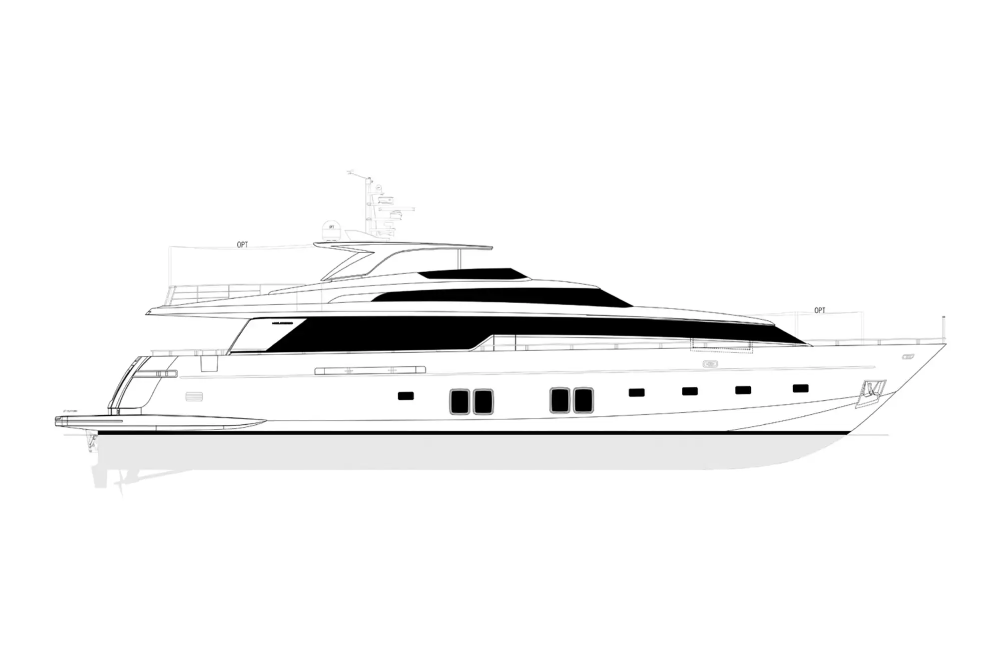 XWAVE’s exterior decks provide a mix of luxury living and outdoor entertainment. The vast fly bridge is a highlight. This adaptable space features a sun lounging area aft, with a covered al fresco dining area and wet bar forward. The main deck aft hosts another al fresco dining area or can be used as a lounging area for sea-level living. The swim platform provides easy access for watersports and is connected to the transom tender garage, which houses a 4.5m (14.8ft) tender and a jetski.