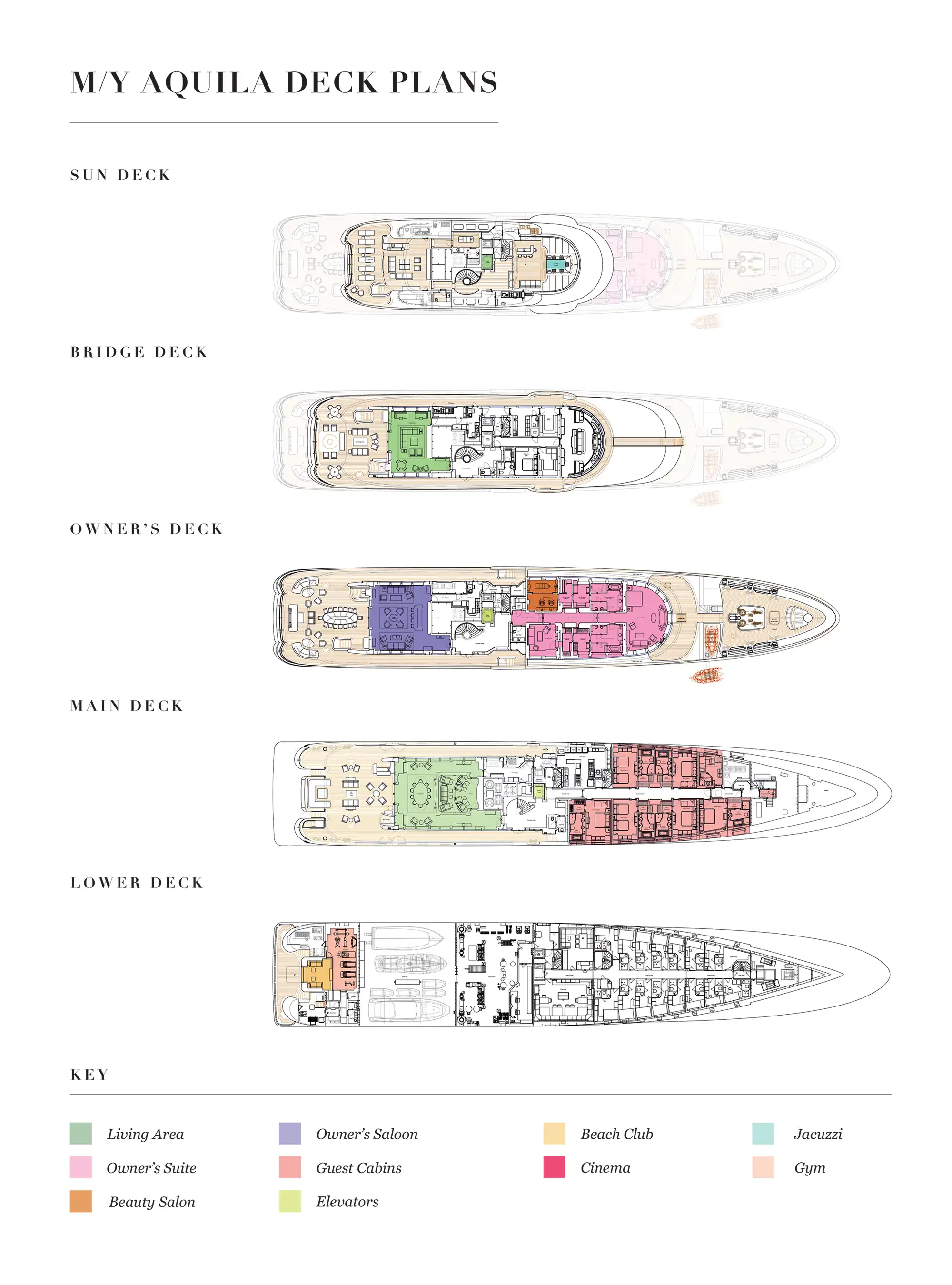 The 85.6m motor yacht offers an abundance of deck space divided into sections to cater for different occasions. The new forward sun deck offers a large jacuzzi, day bar and treatment room. All four decks aft offer an abundance of space for al fresco dining, relaxing and socialising. AQUILA also boasts a dedicated party deck complete with DJ booth, AV system, smoke machine and light show.