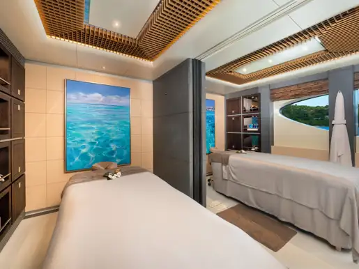 The extensive accommodation on board comprises a unique split owner's suite with stunning ocean vistas and an impressive double height study complete with port and starboard folding balconies and double height glass sliding doors. There is a double guest cabin on the upper deck, four guest cabins and a convertible full beam VIP cabin located on the main deck. Other standout features include a remarkable teak and steel sculpture that envelops the large guest elevator, a spectacular aquarium made to mirror an aquatic reef, an outdoor cinema on the sun deck and a huge lazarette ideal for a watersports enthusiast.