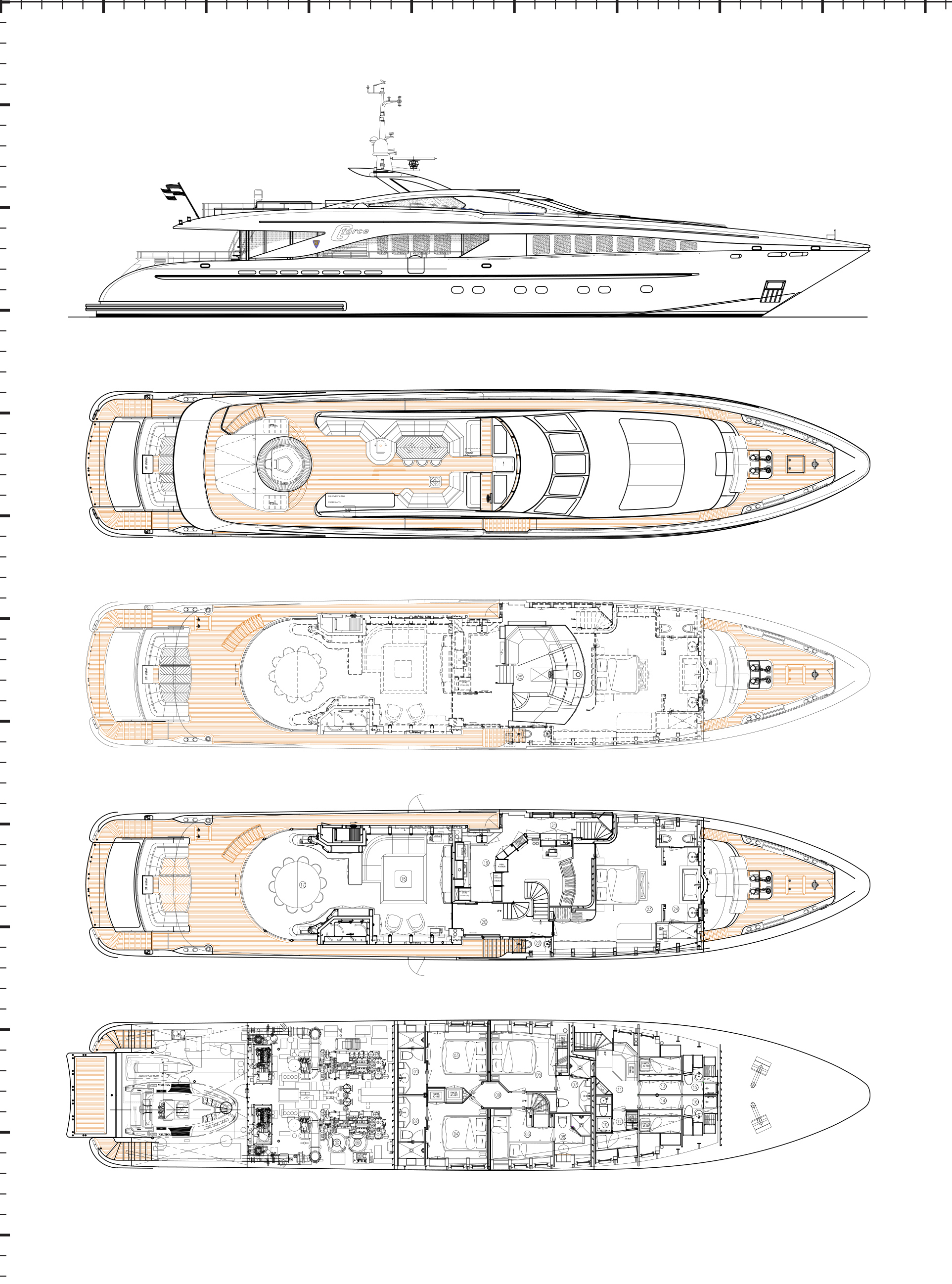 Chief among these 1930s touches is the bathroom in the master cabin, where the bevelled mirror and the wall lights perfectly frame the cinematic glamour of the age. Another highlight is the Macassar ebony dining table beneath a Murano-glass chandelier, surrounded by a semi-circle of sliding glass that opens onto the main deck aft.