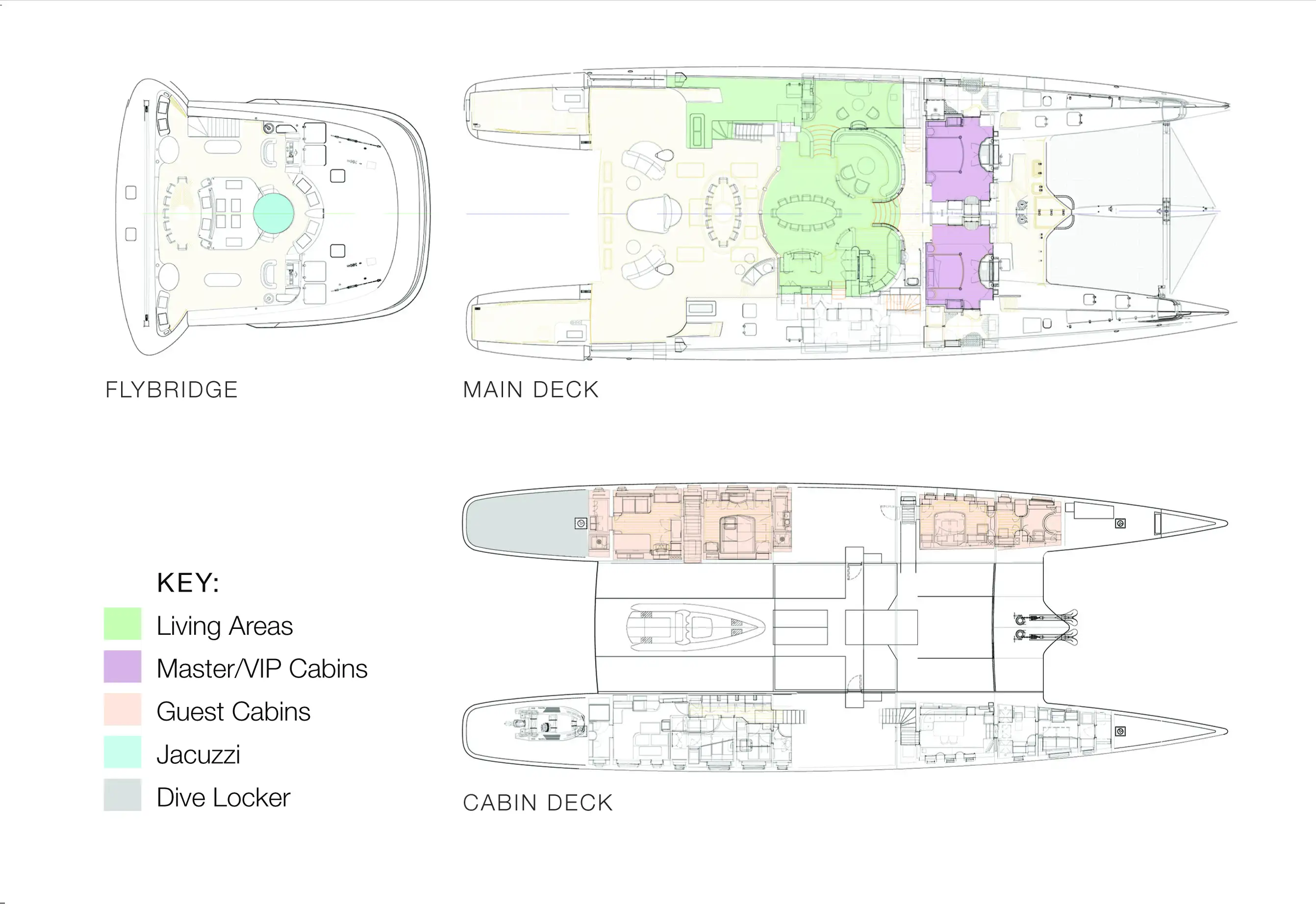 With a 16.6m (54.5ft) beam, her deck spaces are vast. From her flybridge jacuzzi and al fresco dining areas to her shaded spaces on the main deck aft and the sunbathing trampoline forward where you can watch dolphins play underway, she covers every base for relaxation and entertainment. Two VIP cabins on the main deck each have access to a terrace lounge forward and her award-winning interiors are refined yet instantly welcoming.