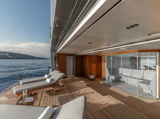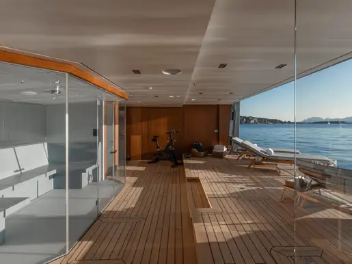 The guest deck enjoys its own entrance and lobby at the stern of the yacht. As you walk to one of five double suites, you will pass the steam room and beach club with its spectacular sea terrace.