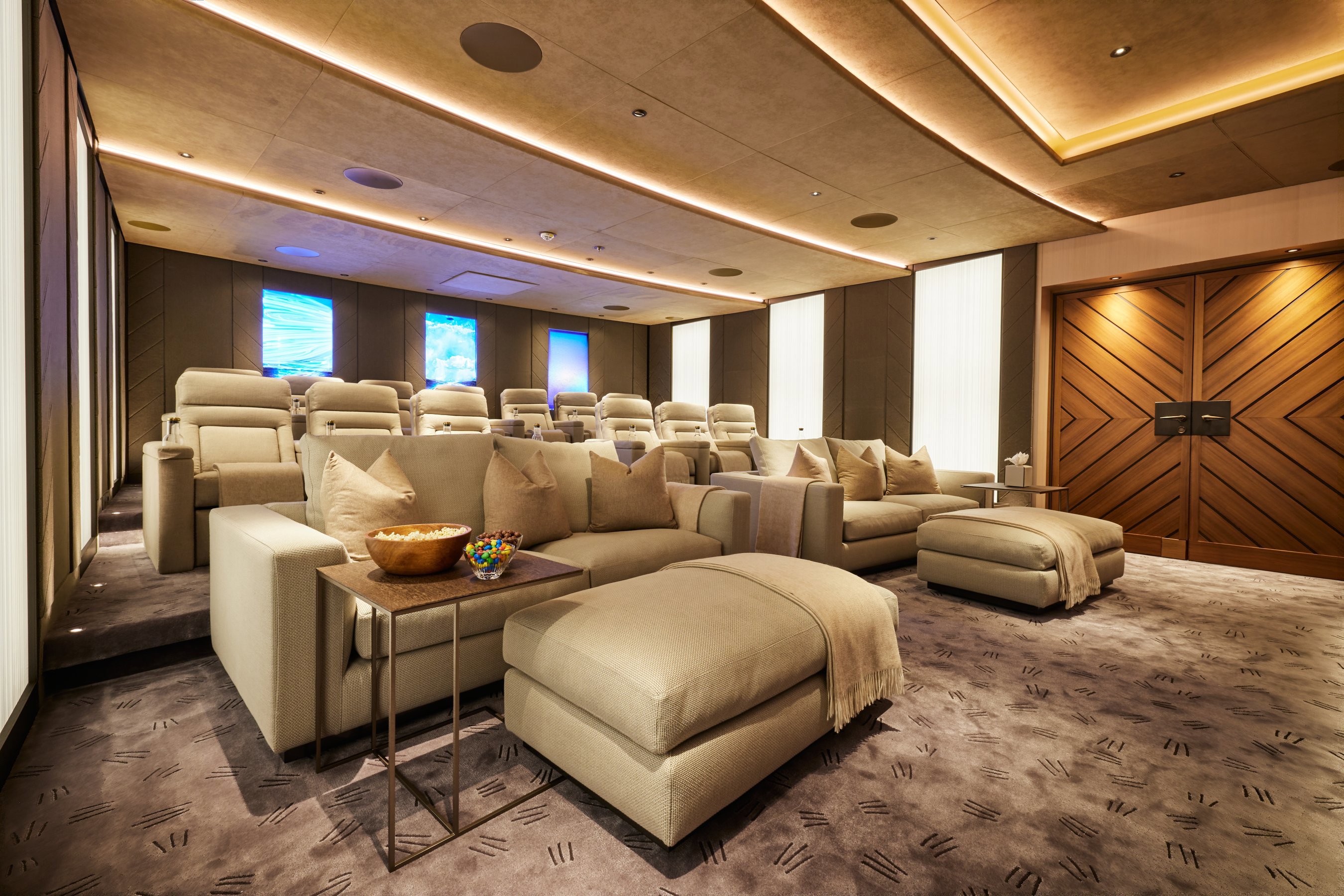 The main deck aft has two bars for all-day refreshment: one is also a sushi bar and the other has a pizza oven for relaxed all-day dining on lazy days around the huge pool. By night, the bars on the bridge and main decks convert into DJ stations for unforgettable entertainment while the lower deck cinema seating 19 guests is the place for that blockbuster experience.