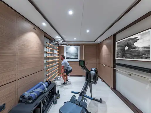 When it’s time for bed, she has extremely versatile accommodation on the lower deck with two master suites, three twin suites and a gym that can convert into a children’s cabin, a nanny’s cabin with cot, or a staff cabin.