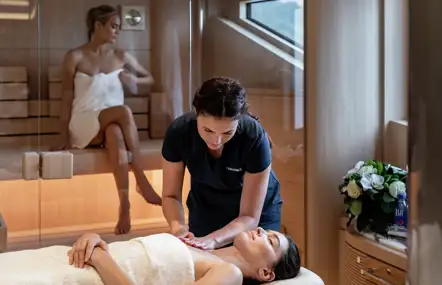 Embarquez à bord d’un yacht avec sauna, hammam, salon de beauté avec thérapeute, salle de massage avec masseuse, salle de glace, bassin profond et piscine à contre-courant.