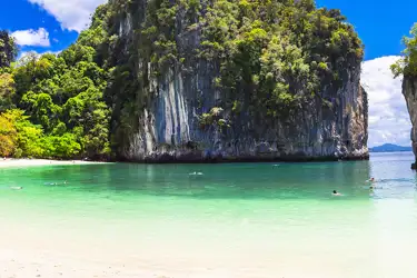After a smooth overnight sail, we awoke at Ko Muk and went to explore Emerald Cave. Having checked it earlier, the crew led us safely for a swim through the 70m-long cave at the end of which you discover a magical lagoon with a white sandy beach and limestone cliffs. A definite highlight.