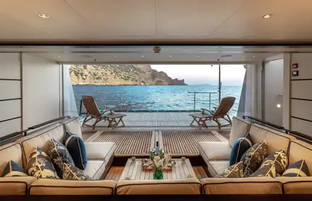 The 85.6m (280.9ft) AQUILA offers an abundance of deck space divided into sections to cater for different occasions, ensuring that your charter doesn’t end in family mutiny. All four decks aft offer plenty of space for al fresco dining, relaxing and socialising, including a dedicated party deck complete with DJ booth, AV system, smoke machine and light show.