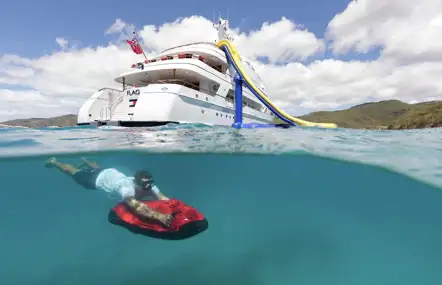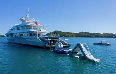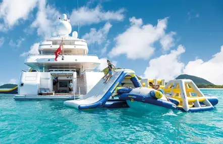 On board the 73m (239.5ft) TITANIA a complete water park can be deployed from the beach club to provide a safe splash zone, inflatable slide, trampoline and climbing frame for your kids to enjoy. The water-level swim platform also offers easy access to the vast inventory of tenders and water toys.