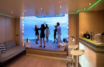 Large sun deck area with built-in speakers and karaoke. She has inside and outside cinemas as well
