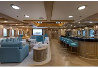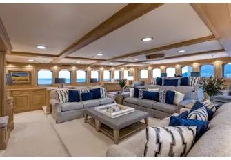 Outside she looks utterly immaculate following a full repaint, all brightwork revarnished, teak decks sanded and recaulked. Inside the great Laura Pomponi has brought her Luxury Projects team to bear with new handmade carpets throughout and a new hardwood floor in the sky lounge, new soft furnishings and fabrics, new sofas in the main guest areas and a scattering of new artworks.