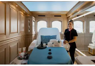 Another new feature is the beauty salon on the upper deck, complete with a professional Nilo chair, which not only enables manicures, pedicures and hair treatments, but also converts into a massage table. After your treatment by the crew's very own beautician and masseuse you can freshen up in the en suite bathroom and shower and emerge energised and ready to take on the world. She also has a second massage room if you need a change of scene.