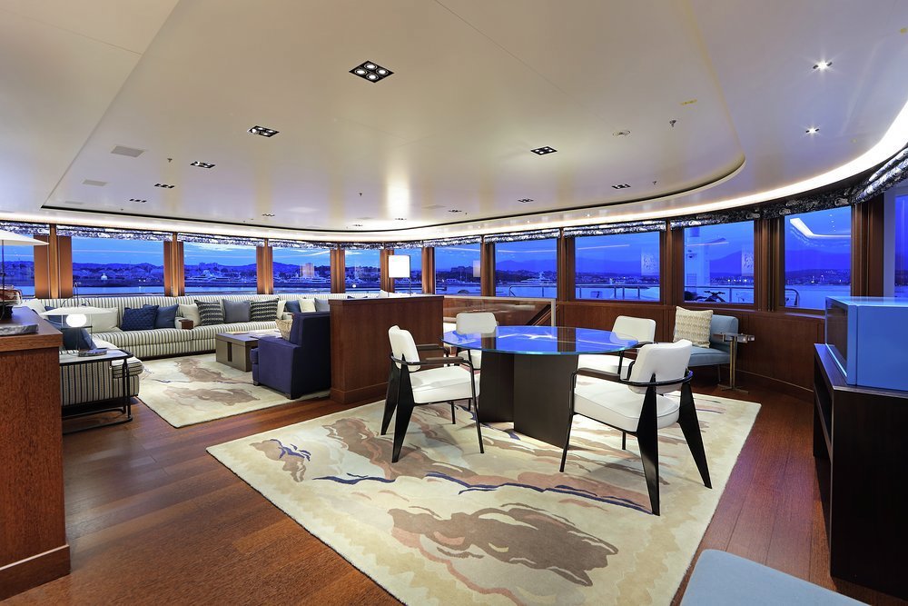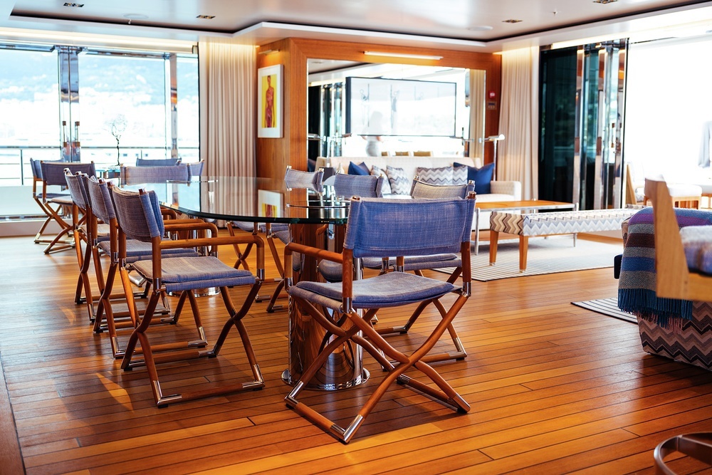 The upper deck dining room with bar and lounge is decked and linked to the outside terrace through sliding glass doors on three sides to create the perfect inside-outside entertainment space. Step outside and the upper deck's walkaround sidedecks lead forward to a more intimate lounge forward.