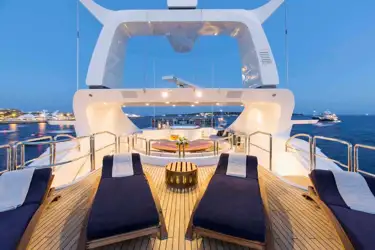 The yacht has extensive exterior spaces. A spacious sun deck has a huge sunpad forward surrounded by steel and glass guardrails to block the breeze but not the view. Aft of that is a jacuzzi with bar and lounge seating and there is a circular dining table beneath the hardtop. Aft of that is a versatile space for sun lounging, exercise or entertainment.