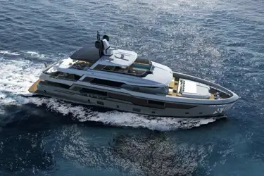 This 432GT yacht has a 150sqm (1,615sqft) sun deck with dining, jacuzzi and bar as well as a sea-level beach club. Interior spaces feature excellent views through near-full-height glass and bulwark cut-outs.