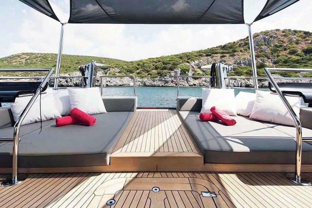Charterers like to come with me to the cockpit when we are sailing, so they can join in on the action. When the sails come down, guests like to sunbathe on the sunpads, or sit in the outdoor dining area under the shade canopy.