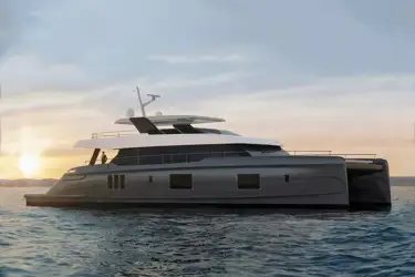 She is a 28.6m (93.8ft) catamaran of composite construction designed and engineered by the yard's in house team. A prodigious beam of 13.5m (44.3ft) gives her a huge amount of deck space, including a sundeck with jacuzzi and sunpads, bar, open air dining, lounge areas, a flybridge and an expanse of versatile deck space. There are sunpads and another open air dining option on the main deck aft and a spacious foredeck terrace with lounge areas and more sunpads.